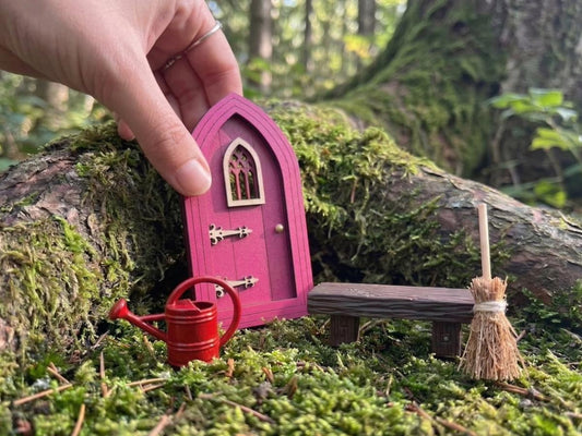 Fairy Door Starter Kit - Mini Fairy Garden Gift Set with Door, Bench, Broom and Watering Ca