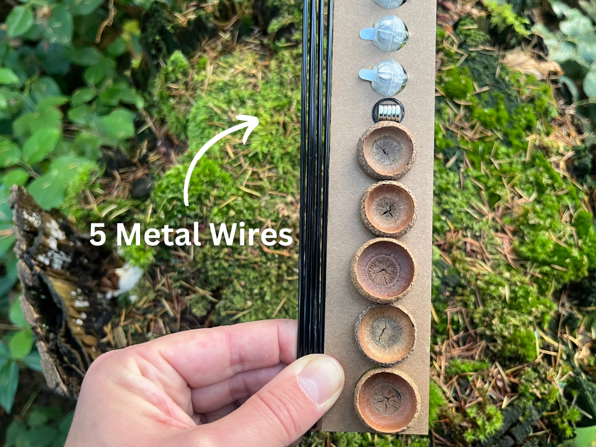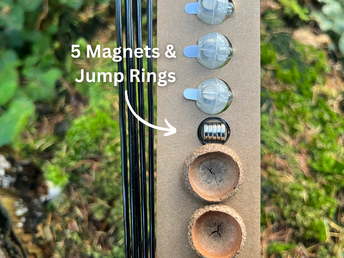To craft your lanterns, simply shape the wire, glue the magnet in place, insert the jump ring into the pre-drilled hole in the acorn caps, and add the light.