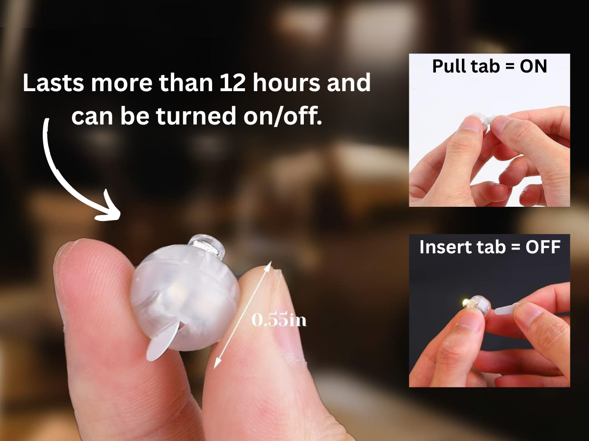The lights are powered by two small batteries, lasting approximately 24 hours. Turn them on or off by removing or reinserting a plastic strip.
